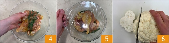 Masajead la carne con las manos para sazonarla uniformemente 4, luego cubrid con film transparente 5 y dejad marinar en el frigorífico durante 30 minutos. Mientras tanto, sacad del coliflor entero 4 rodajas de aproximadamente 1 cm de grosor 6. Picad groseramente el resto de la coliflor y reservadlo, os servirá para hacer la crema.