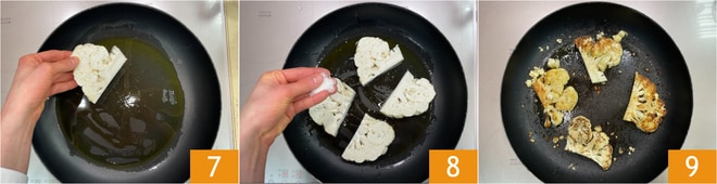 Calentad bien un chorrito de aceite en una sartén antiadherente, luego colocad las rodajas de coliflor 7, salpimentad 8 y cocinad a fuego alto hasta que estén doradas (tardarán un par de minutos), luego girad las rodajas, salpimentad nuevamente y dorad el otro lado también 9. Transferid las rodajas de coliflor a una bandeja de horno forrada con papel de horno y reservad.
