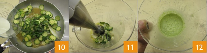 Incorporad ahora la nata 10, trasladad los calabacines a un vaso alto y trituradlos con la batidora de mano 11 para obtener una crema homogénea 12. Reservad.
