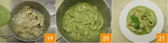 Añadid también la crema de calabacines 19, saltead en la sartén durante unos 5-8 minutos para amalgamar y sazonar. Servid el pollo con crema de calabacines bien caliente con un chorrito de aceite en crudo 21.