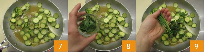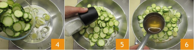 Añadid también los calabacines 4, salpimentad 5 y rehogados a fuego moderado durante 4-5 minutos. Luego verted el caldo 6 y continuad la cocción durante 10 minutos a fuego medio-bajo.