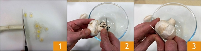 Para preparar el pollo con crema de champiñones y endivia, lo primero es hacer la crema de champiñones. Cortad el puerro en rodajas 1, luego pasad a la limpieza de los champiñones. Eliminad la tierra de la base 2 y pelad los champiñones 3.