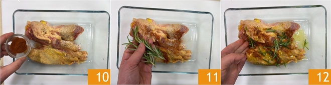Colocad el pollo en piezas en un bol, sazonadlo con sal, pimienta negra y pimentón 10. Añadid las ramitas de romero 11, un chorrito de aceite y masajead el pollo 12.
