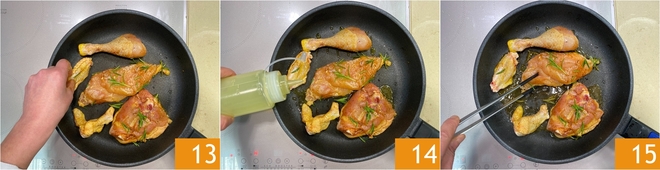Calentad una sartén y colocad en ella los trozos de pollo con la piel hacia abajo 13. Dejad que se doren, añadid otro chorrito de aceite 14 y dad la vuelta a los trozos de pollo 15. Doradlos bien, luego bajad el fuego y coced durante unos 20 minutos.