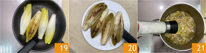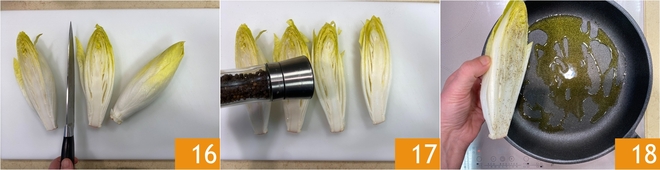 Mientras tanto, pasad a la endivia. Lavadla y cortadla por la mitad 16. Sazonad con sal y pimienta 17. En una sartén echad un chorrito de aceite, calentadlo y colocad la endivia en el interior 18.