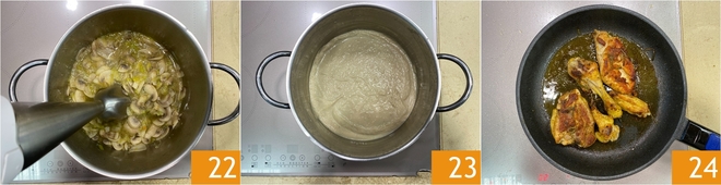 Triturad con una batidora de mano 22 hasta obtener una crema 23. En este punto también el pollo estará listo, debe quedar bien dorado 24.