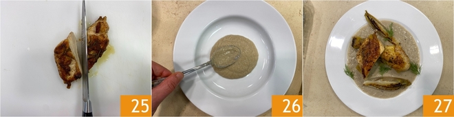 Cortad por la mitad los trozos más grandes 15 y emplatad colocando la crema en el fondo 16. Colocad encima el pollo, la endivia y decorad con eneldo 27.