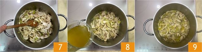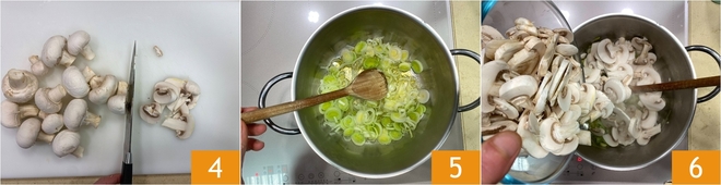 Cortadlos entonces en láminas 4. Echad en una cazuela un chorrito de aceite y el puerro 5, dejadlo pochar a fuego medio, luego añadid los champiñones 6.