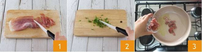Para preparar el pollo con jamón serrano al tomate, comienza superponiendo las lonchas de jamón una sobre otra. Luego córtalo en tiras de 2 cm 1. Pica también el perejil y resérvalo 2. Luego, vierte un chorrito de aceite en una sartén, agrega el jamón serrano 3