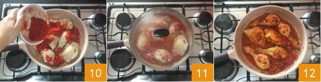 Espera unos 3 minutos, luego añade la pulpa de tomate 10, sala, mezcla y cubre con una tapa 11. Deja cocinar durante otros 50 minutos a fuego bajo. El pollo con jamón serrano y tomate está listo para servir 12.