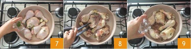 el perejil 7 y dora las piezas de pollo por ambos lados 8. Luego, desglasa con el vino blanco 9.