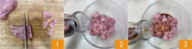 Para preparar el pollo gong bao, comience cortando la pechuga de pollo primero en tiras y luego en cubos 1. Coloque los cubos de pollo en un bol y sazone con vino de arroz 3 y salsa de soja 3.