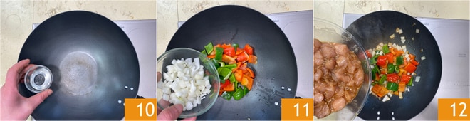 Caliente un wok, luego vierta un poco de aceite de semillas 10 e incorpore las verduras 11. Saltee brevemente las verduras mezclando, luego agregue el pollo 12.