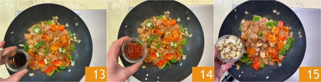 Mezcle y saltee a fuego vivo, luego desglase con salsa de soja 13. Añada también la salsa picante 14 y los cacahuetes 15.