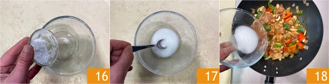 En un bol pequeño, vierta el agua y la fécula de patata 16, luego mezcle bien 17. Cuando el pollo esté bien cocido, vierta la mezcla en el wok 18 y cocine un par de minutos más.