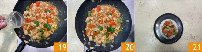 Al final de la cocción, un chorrito de aceite de semillas para darle brillo al plato 19. ¡Su pollo gong bao está listo para servir 20 acompañado de arroz cocido al vapor 21!