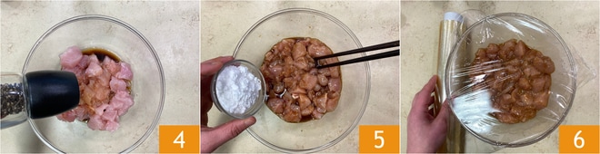 Sazone con sal y pimienta 4, mezcle y añada la fécula de patata 5. Mezcle nuevamente y luego deje reposar durante 30 minutos cubierto con film en un lugar fresco y seco 6.