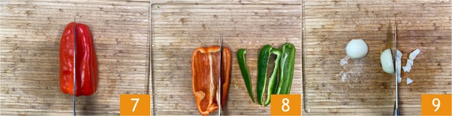 Tome los pimientos y córtelos primero en tiras 7 8 y luego en trozos. Pele y corte la cebolla también en trozos 9.