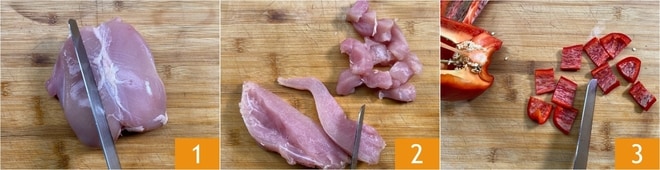 Para preparar el pollo en salsa agridulce, primero prepara los ingredientes: limpia la pechuga de pollo de cartílagos y huesecillos 1, luego córtala en cubos de aproximadamente 2,5 cm 2. Limpia el pimiento y córtalo en trozos del mismo tamaño 3.
