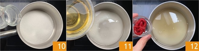 Deja la masa a un lado y ocúpate de la salsa agridulce: en un cazo vierte el azúcar junto con el agua 10 y el vinagre de vino blanco 11, luego enciende el fuego a temperatura media-alta y deja que el azúcar se disuelva. Ahora añade el concentrado de tomate 12, mezcla con el batidor y cocina durante unos minutos.