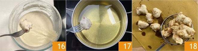 Estás listo para freír: calienta el aceite hasta una temperatura de 170°, luego cubre los trozos de pollo con la masa, dejando caer el exceso 16. Sumerge unos pocos trozos a la vez en el aceite caliente 17 y fríe durante 3-4 minutos. Una vez dorados, escurre los trozos en papel para frituras y deja a un lado 18.
