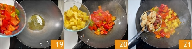Después de haber frito el pollo, calienta bien un wok, luego añade el aceite, los pimientos 19 y la piña 20. Y sofríe a fuego alto durante 8-9 minutos. Añade los trozos de pollo fritos 21 y saltea todo junto durante un par de minutos.