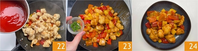 En este punto, vierte la salsa agridulce en la sartén 22 y mézclala saltando brevemente todo. Apaga el fuego y aromatiza con cebollino picado 23, después de lo cual tu pollo en salsa agridulce está listo para ser servido 24!