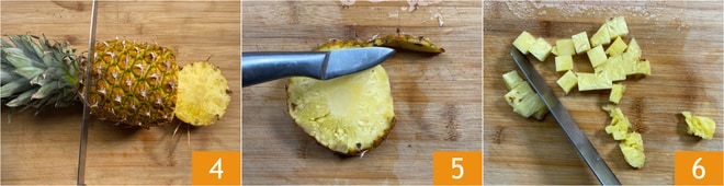 Finalmente, elimina la base y la corona de la piña 4, luego córtala en rodajas, quita la cáscara 5 y reduce 230 g de pulpa en cubos, siempre del tamaño de aproximadamente 2,5 cm 6.