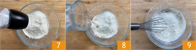 Pasa a la masa: pon la harina en un bol y añade la sal 7, luego vierte el agua en un hilo mientras mezclas con un batidor 8 hasta obtener una mezcla homogénea y sin grumos 9.