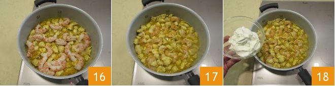 Añade las gambas 16 y cocina durante unos 2 minutos 17, removiendo de vez en cuando. Luego agrega el yogur griego 18