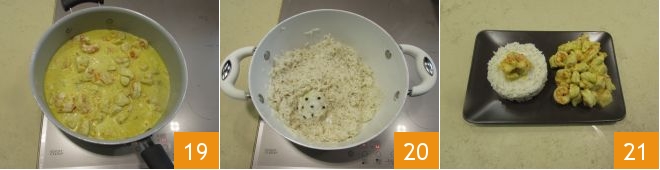 y mezcla hasta incorporarlo a los otros ingredientes 19. Ajusta de sal y apaga el fuego. Mientras tanto, el arroz también estará cocido 20. ¡No te queda más que servir el pollo y gambas al curry con arroz basmati todavía caliente 21!