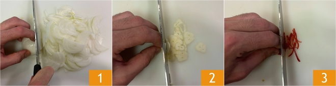 Para preparar el pollo yassa, primero limpia y corta finamente las cebollas 1, luego corta en rodajas finas el ajo 2 y el chile 3.