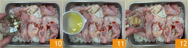 Vierte el aceite de semillas 10, el jugo de limón 11 y la mostaza 12.