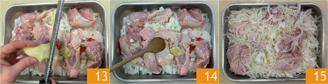 Finalmente, ralla el jengibre fresco 13, mezcla con una cuchara de madera 14 y deja marinar durante 6-8 horas en el frigorífico, cubierto con film transparente 15.
