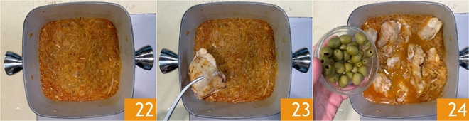 Cocina durante unos 30 minutos 22. Pasado este tiempo, añade el pollo 23 y las aceitunas verdes 24. Cubre con la tapa y cocina durante otros 30 minutos a fuego medio-bajo.