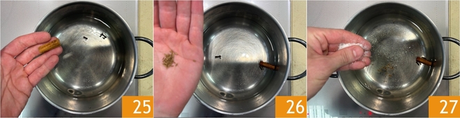 Mientras tanto, prepara el arroz: vierte el agua en una olla, luego aromatiza con el palo de canela 25, los clavos de olor, las semillas de comino 26 y la sal gruesa 27.