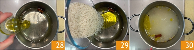 Añade también el aceite 28 y enciende el fuego. Cuando el agua esté a punto de hervir, vierte el arroz 29 y cocina a fuego medio durante 12 minutos; el agua debe hervir suavemente 30.