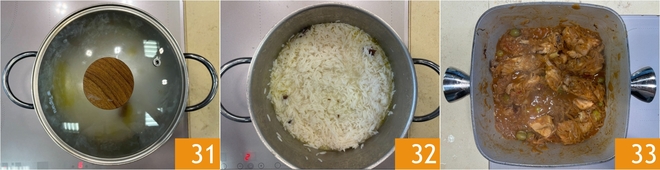 Pasado el tiempo de cocción, apaga el fuego, cubre con la tapa y deja reposar durante 2 minutos 31 para que absorba toda el agua 32. Mientras tanto, también habrá pasado el tiempo de cocción del pollo, verifica que haya absorbido casi todo el caldo 33.