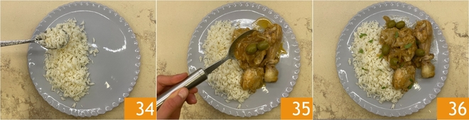 Sirve el arroz 34 y el pollo con su salsa 35, luego decora con algunas hojitas de cilantro. ¡Tu pollo yassa está listo para ser servido 36!