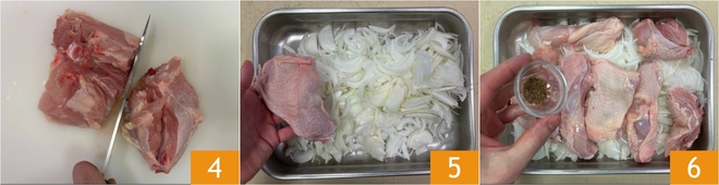 Si los muslos de pollo son grandes, divídelos en 2 partes 4. Pon las cebollas en una bandeja grande, luego coloca los trozos de pollo 5 y espolvorea con las semillas de comino 6.