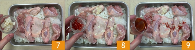 Añade también el ajo 7, el chile 8 y el vinagre de vino tinto 9.