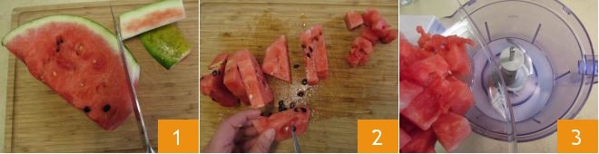 Para realizar los polos de sandía, primero corta la sandía en rodajas, luego elimina la cáscara 1, córtala en trozos 2 y extrae las semillas. Obtén 530 g de pulpa y viértela en el bol del procesador de alimentos 3.