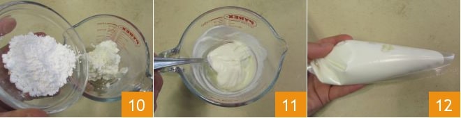 Mientras tanto, vierte en un vaso el yogur y 20 g de azúcar glas 10, mezcla para amalgamar 11 y luego transfiere la crema obtenida a una manga pastelera desechable sin boquilla 12.