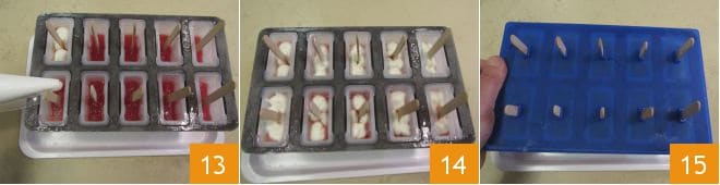 Transcurrido el tiempo de enfriamiento, extrae los polos, exprime una capa de crema 13. Deja siempre un poco de espacio del borde que se llenará con la última mezcla 14. Cierra con la tapa 15 y vuelve a poner en el congelador por al menos 30 minutos.