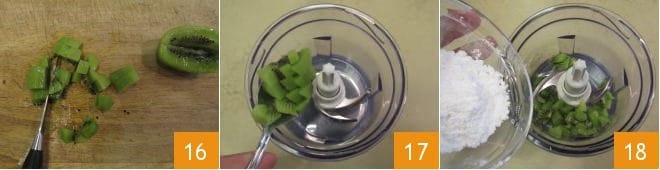 Mientras tanto, pela el kiwi y córtalo en trozos 16. Vierte los trozos en el procesador de alimentos 17, añade 15 g de azúcar glas 18 y tritura.