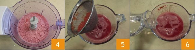 Tritura la pulpa hasta obtener una mezcla suave 4. Cuélala a través de un colador 5 e incorpora el vodka 6.
