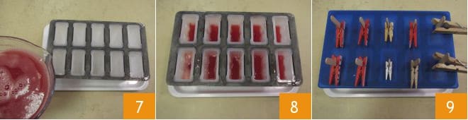 Mezcla y vierte el líquido en el molde para polos 7 dejando 2-3 cm de espacio desde el borde 8. Cierra con la tapa del molde, coloca los palitos asegurándolos con pinzas de madera, para que no se hundan hacia el fondo 9. Deja solidificar en el congelador durante 2-3 horas.