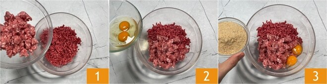 Para preparar las albóndigas al limón, une en un bol la carne picada de res y la salchicha desmenuzada 1, luego añade los huevos 2 y el pan rallado 3.