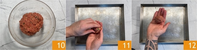 Deberás obtener una mezcla compacta y homogénea 10. Toma unos 55 g de mezcla y da a la albóndiga una forma redonda 11, aplastándola ligeramente en los extremos 12.