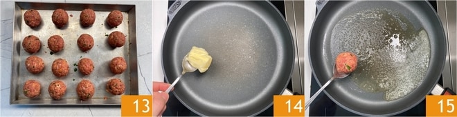 Con estas cantidades obtendrás 16 albóndigas 13. En una sartén grande, derrite la mantequilla 14 y coloca las albóndigas aquí 15.